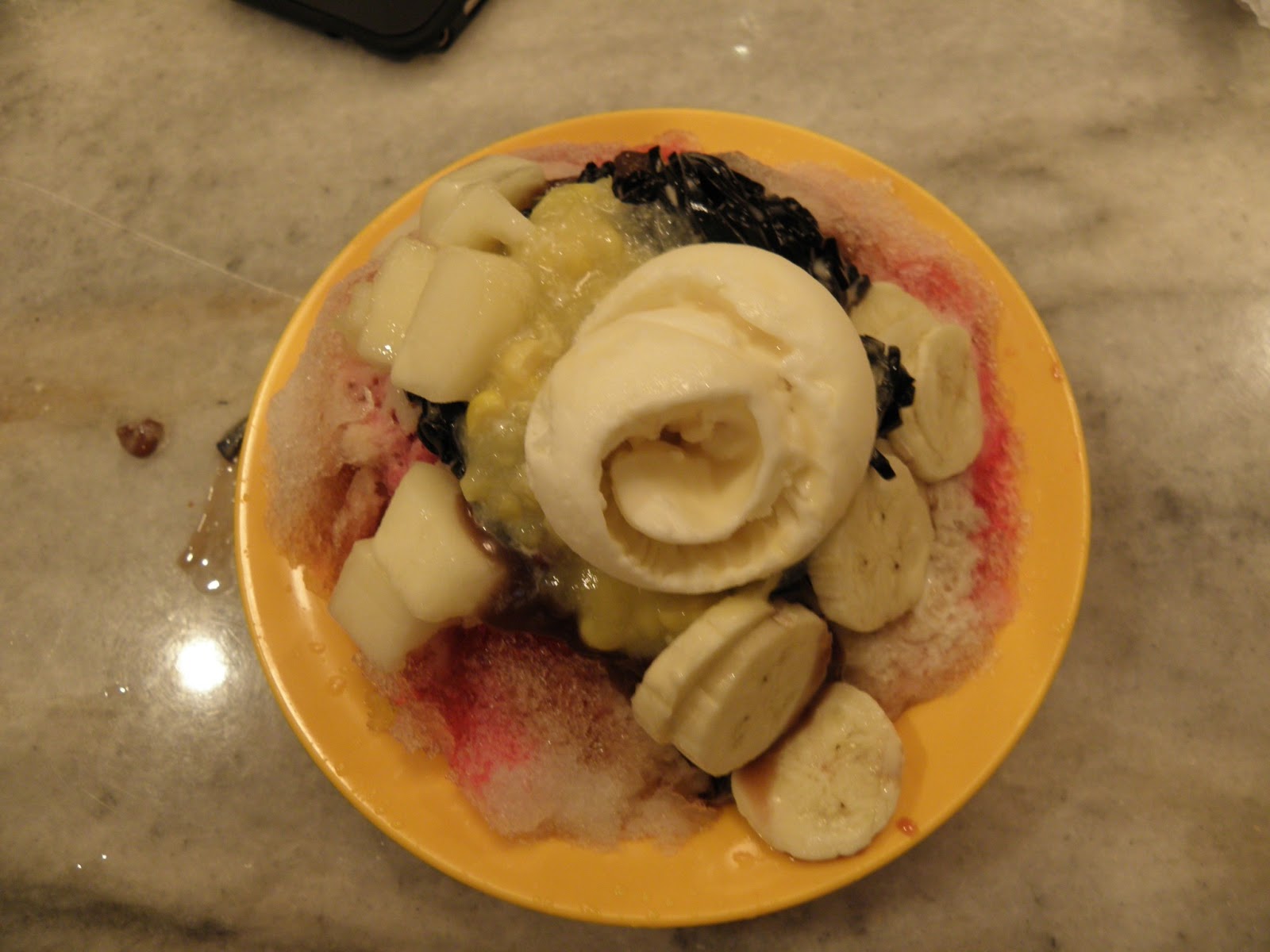 ABC Ice Kacang with fruits. It costs RM5.00. The shaved ice consists of corns, red beans, atapchi, grass jelly, syrup and fruits. It is a good idea to have a bowl of ice kacang during hot weather.